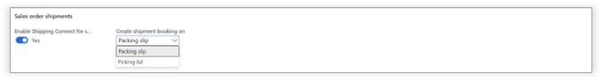 When the parameter is set to "Packing slip", a shipment booking is created automatically when the packing slip on the sales order is generated. The package set up on the shipment booking will be based on the configured package of the selected mode of delivery set on the sales order. See for more information section Mode of Delivery.